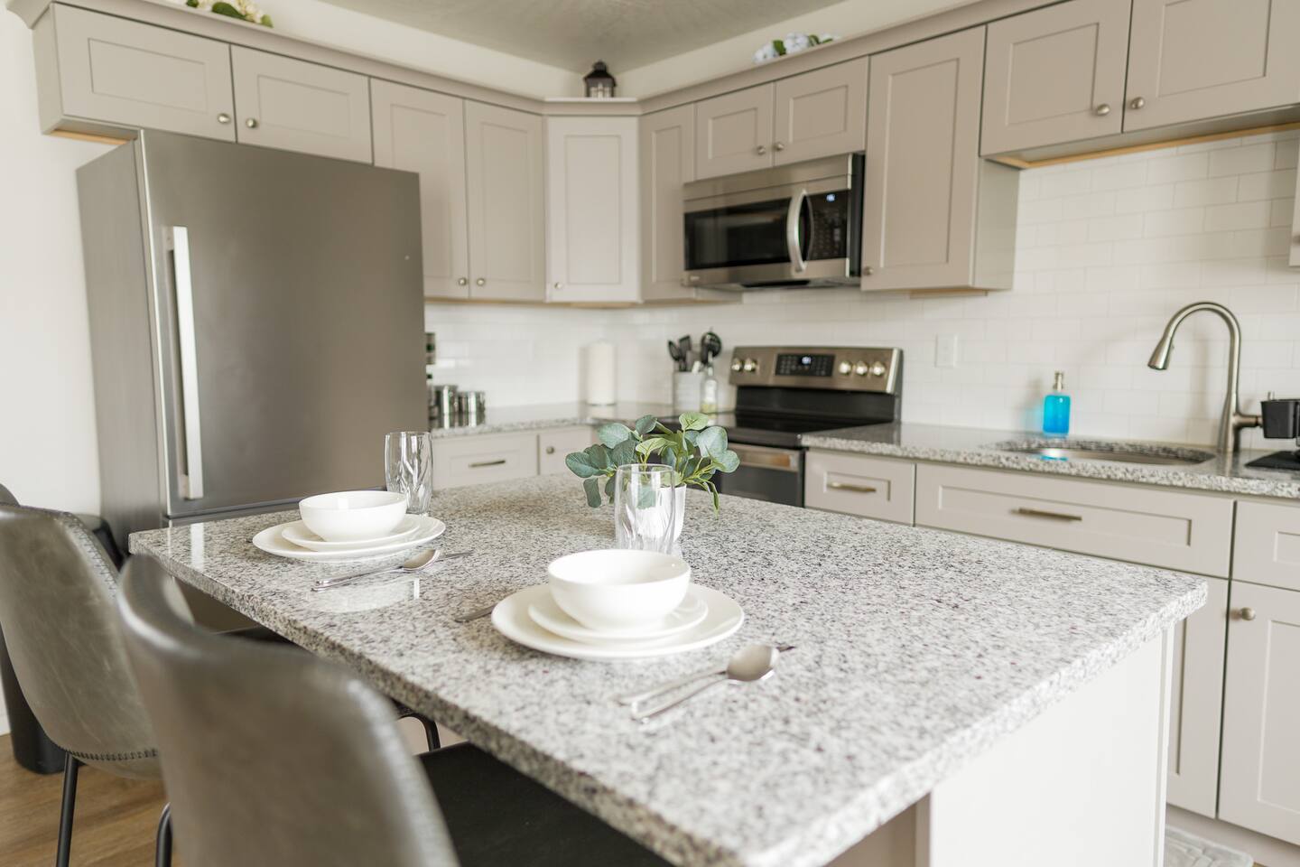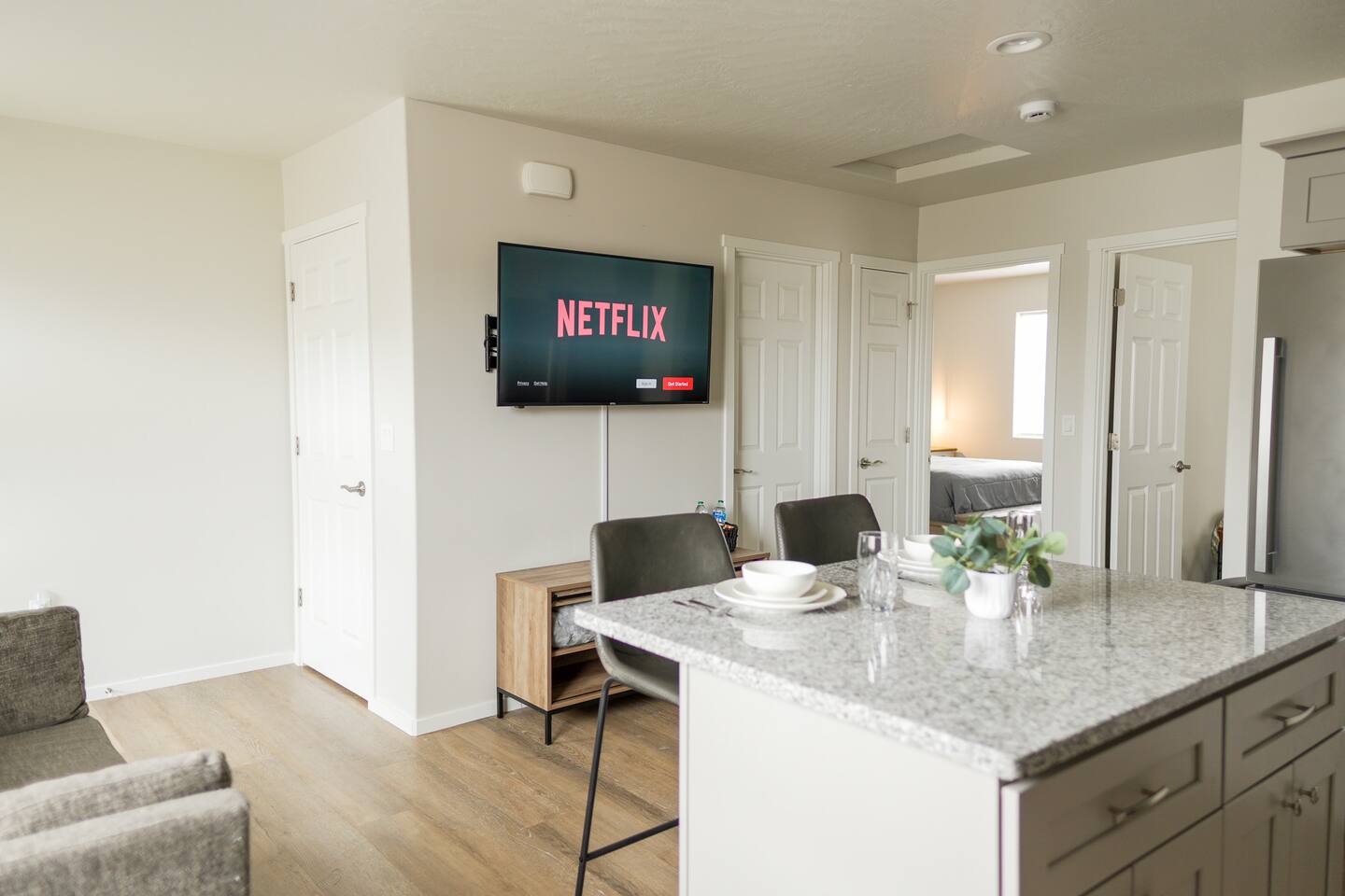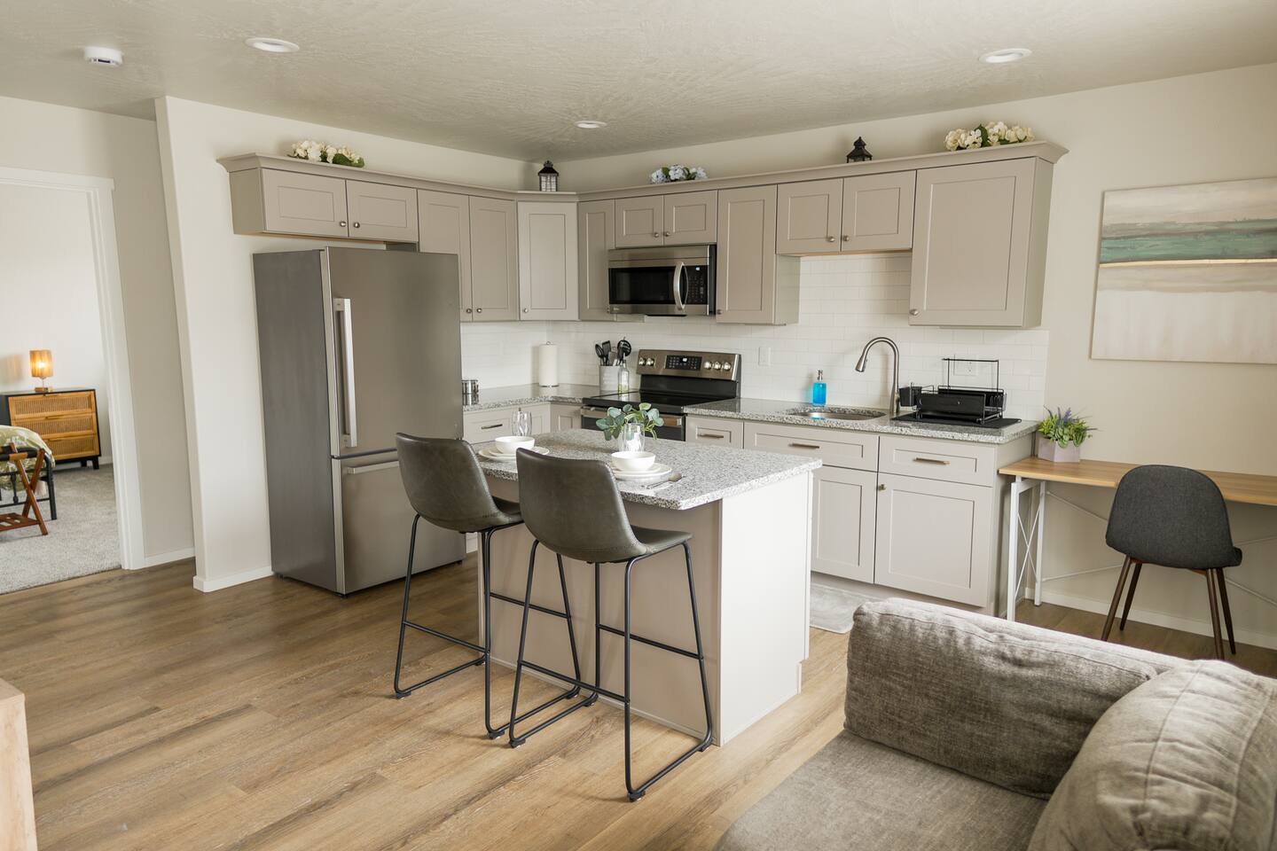 Living & Dining: • Immerse yourself in the light-filled living area, featuring inviting seating arrangements and a plush couch, perfect for movie nights or relaxing evenings. • Whip up culinary masterpieces in the well-equipped kitchen, boasting modern appliances and ample space to unleash your inner chef. Enjoy quick bites at the breakfast bar, which is ideal for casual mornings or cozy evenings. Bathroom: • A sparkling full bathroom ensures your comfort and convenience. Bedroom: "1 Queen / 2 Twins" • Find your sanctuary in the spacious bedroom, featuring a plush queen-sized bed, promising the perfect night's sleep. • Unwind after a day of exploring the cozy living area, featuring comfortable seating and a Smart TV for entertainment. • Ample storage space in the closet allows you to unpack and make yourself at home. Additional Features: • FAST Wi-Fi throughout the home keeps you connected. • In-unit laundry ensures convenience during your stay. • Parking is available for your ease of access. This two-bedroom gem offers everything you need for a comfortable and memorable stay in Tri-Cities, WA.